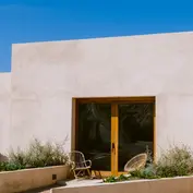 Each bedroom is designed as a peaceful retreat, with calming earthy tones, waxed concrete floors, and elegant wood-framed windows. The en-suite bathrooms add a touch of luxury, with distinctive features like the circular bathtub in the principal suite that offers breathtaking ocean views, and a shower set against a backdrop of rugged rock in another room, blending the interior with the natural surroundings.