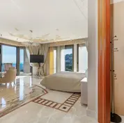 Inside, the villa exudes sophistication with its marble flooring, high ceilings, and natural light flooding through floor-to-ceiling glass doors. The spacious living room, measuring over 100 m², opens directly to the terrace, blending indoor and outdoor spaces seamlessly. Adjacent is a fully equipped kitchen with top-tier appliances, ideal for entertaining guests.