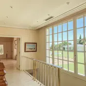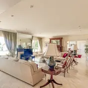 The main residence welcomes you with an elegant entrance hall that divides the day and night areas. The main living room is bathed in natural light, thanks to its large windows and south-facing orientation, providing a seamless connection to the porch and garden. Adjacent to the living room is a spacious dining room, ideal for hosting gatherings, with its picturesque views of the Mediterranean. For moments of quiet reflection, the villa features a charming library and office, beautifully appointed with custom shelving and a classic fireplace.