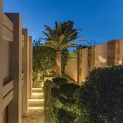The outdoor spaces are meticulously designed to enhance privacy while maintaining a close connection to the natural landscape. A comfortable lounge area, nestled beneath trees, offers the perfect spot to enjoy the magnificent sunsets Ibiza is renowned for. As the sun dips into the horizon, the interplay of light and shadows creates a truly magical ambiance, especially from the villa’s serene seating areas.