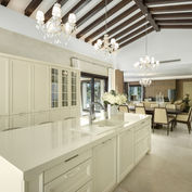 The open-plan dining and kitchen area, characterised by high ceilings with wooden beams, offers a spacious and functional environment. The kitchen is a chef’s dream with plenty of counter and storage space, a central island with seating and state-of-the-art integrated appliances.