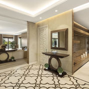 Inside, the refined interior design showcases a seamless transition between indoor and outdoor spaces through glass sliding doors. The grand living area boasts fine furniture and fixtures, complemented by wooden accents that bring soothing earthy tones.