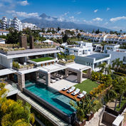 This architectural masterpiece, nestled in the prestigious area of Nueva Andalucía, is a true epitome of modern luxury. Located just minutes away from the vibrant Puerto Banús and within walking distance of numerous local amenities, this extraordinary property seamlessly blends stunning design with an unbeatable location. The villa's striking exterior is highlighted by a magnificent infinity pool that seems to stretch effortlessly from the garden to the interior, accentuated by elegant LED lighting for an enchanting night-time ambiance. A spacious terrace offers multiple lounge areas and alfresco dining spaces, perfect for entertaining guests or enjoying peaceful relaxation in style.