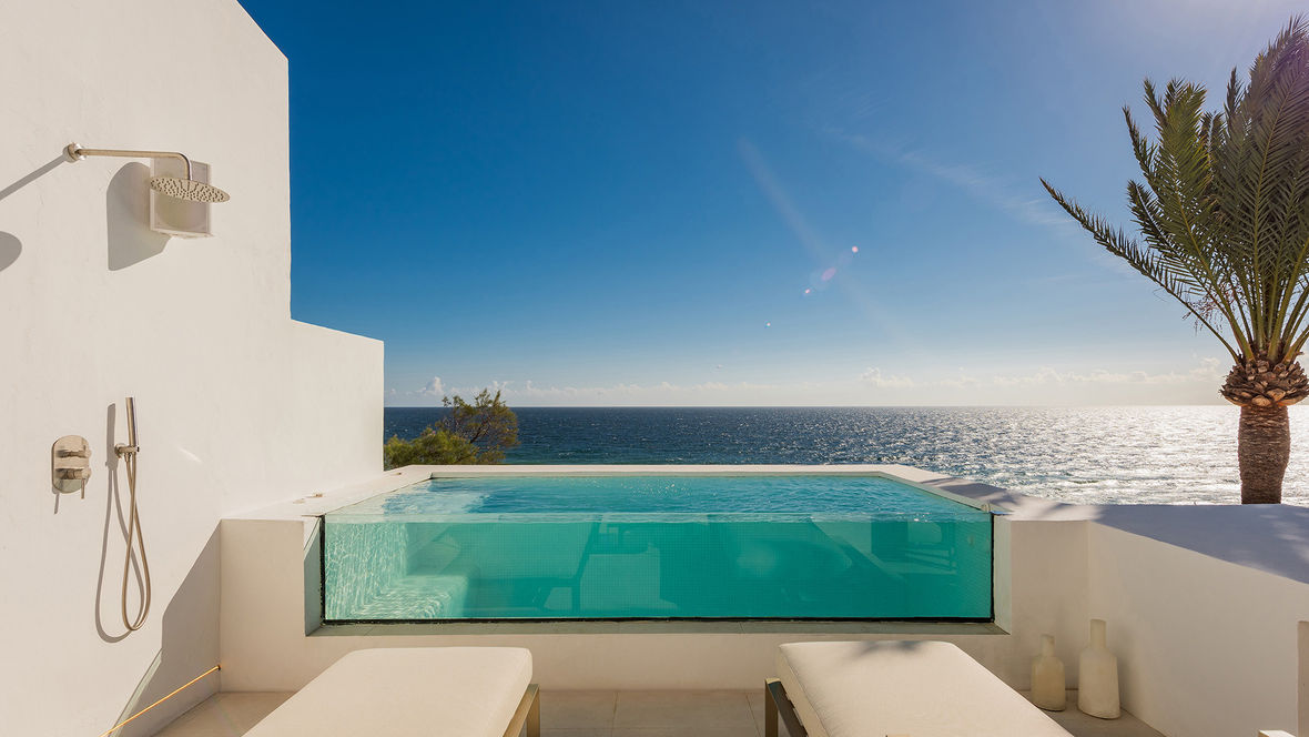 Upon entering, residents are greeted by an expansive living area bathed in natural light. Impeccable furnishings and bespoke details, including a stunning backlit feature wall around the entertainment center, set a tone of sophistication. The interiors seamlessly extend to the outdoor terraces, which invite alfresco dining with a fully equipped kitchenette and multiple lounge areas. Here, the private pool takes center stage, offering breathtaking views over the Mediterranean Sea – a perfect oasis for relaxation.
