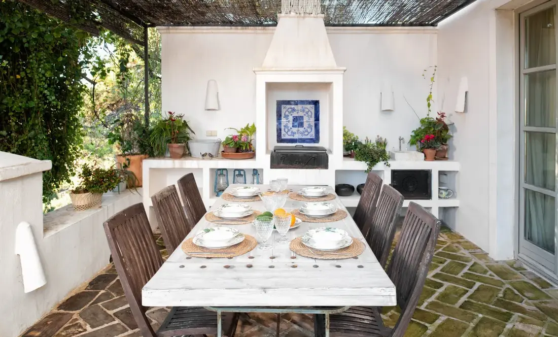 The outdoor areas are equally impressive, with a charming internal patio filled with mature lemon trees and aromatic plants, an orchard with a variety of fruit trees, and a vegetable garden.