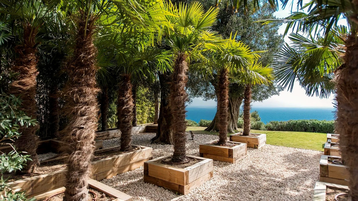 The garden is richly decorated with two 300-year-old olive trees, Mallorca palm trees, and exotic flora, providing a peaceful and tranquil oasis. The property outside leisure area contains a 25-meter-long infinity pool, a tropical waterfall, a large jacuzzi, and an exotic private Tiki-bar.