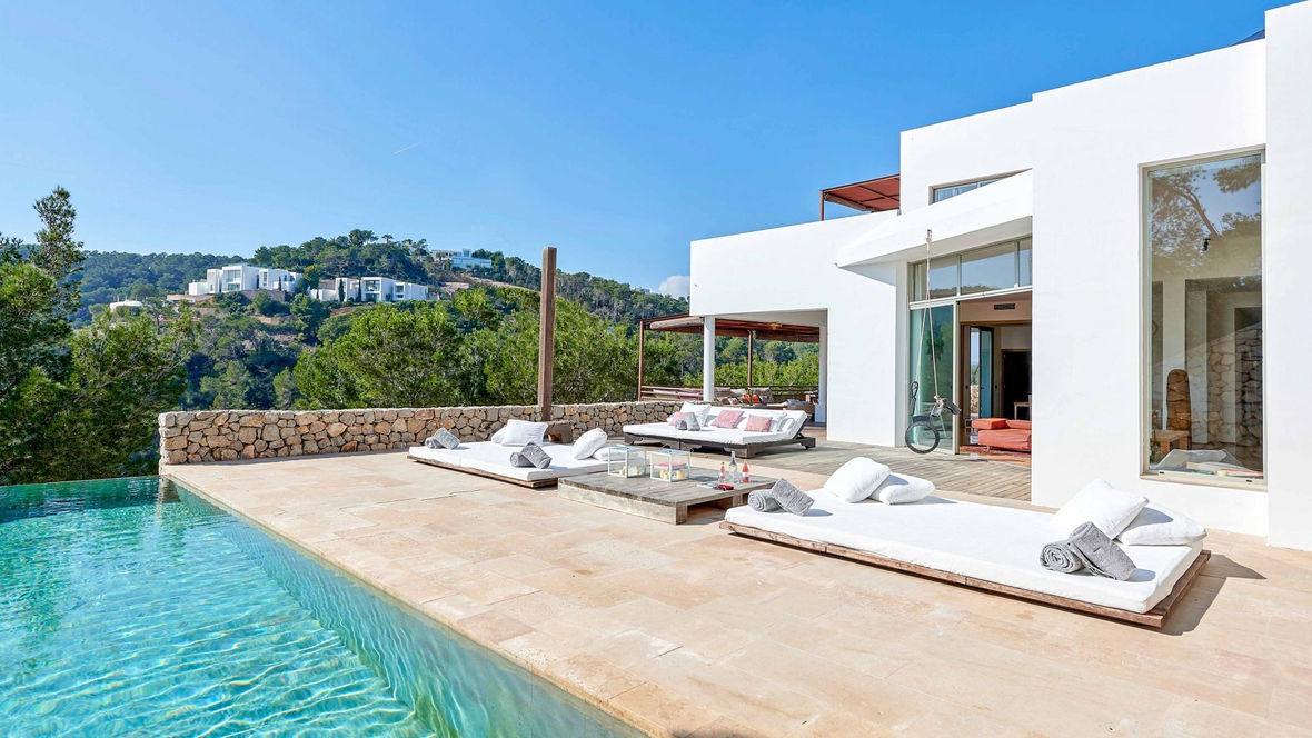 Encompassing a main house and an annexe, the property comfortably accommodates up to ten guests across five elegant double bedrooms, each with en-suite facilities. The heated infinity pool, framed by a spacious terrace, invites relaxation alongside sunbeds and a Jacuzzi. Outdoors, a large social area offers a lounge and dining patio, perfect for gatherings with breathtaking views of Formentera.
