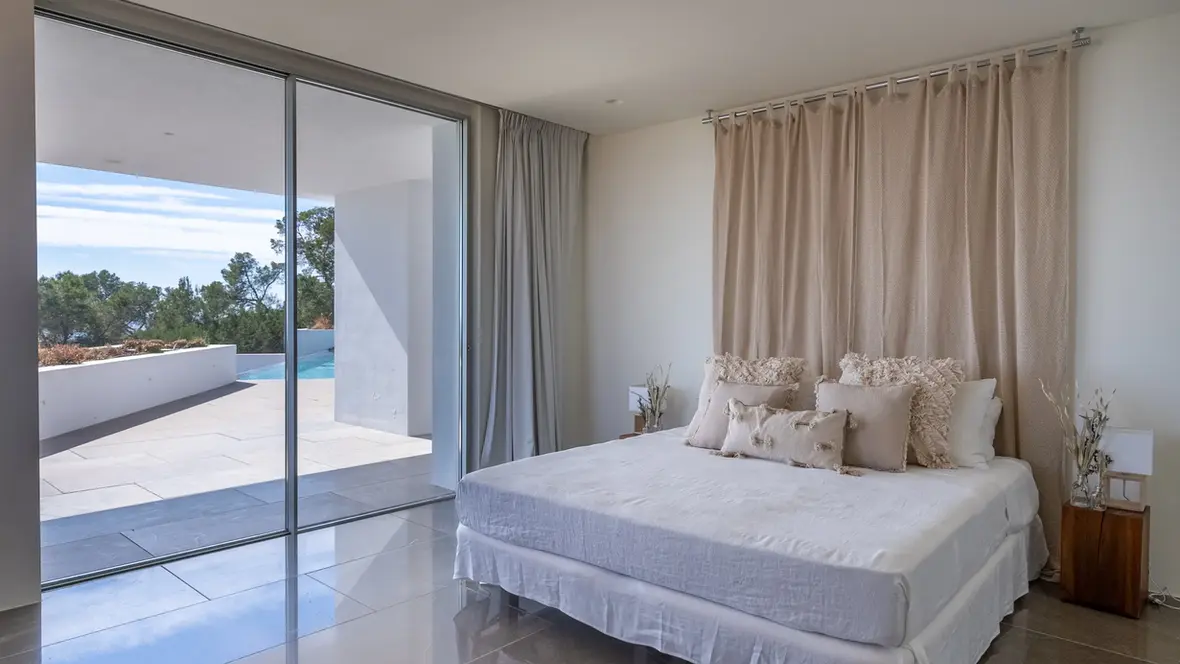 Nestled between the prestigious locales of Cala Jondal and Porroig, this villa epitomizes modern luxury in Ibiza’s most exclusive enclave. A testament to contemporary architecture, this property is designed to capitalize on its remarkable surroundings, featuring expansive glass walls and open spaces that harmonize with the stunning landscape and vast sea views, capturing the essence of refined island living.