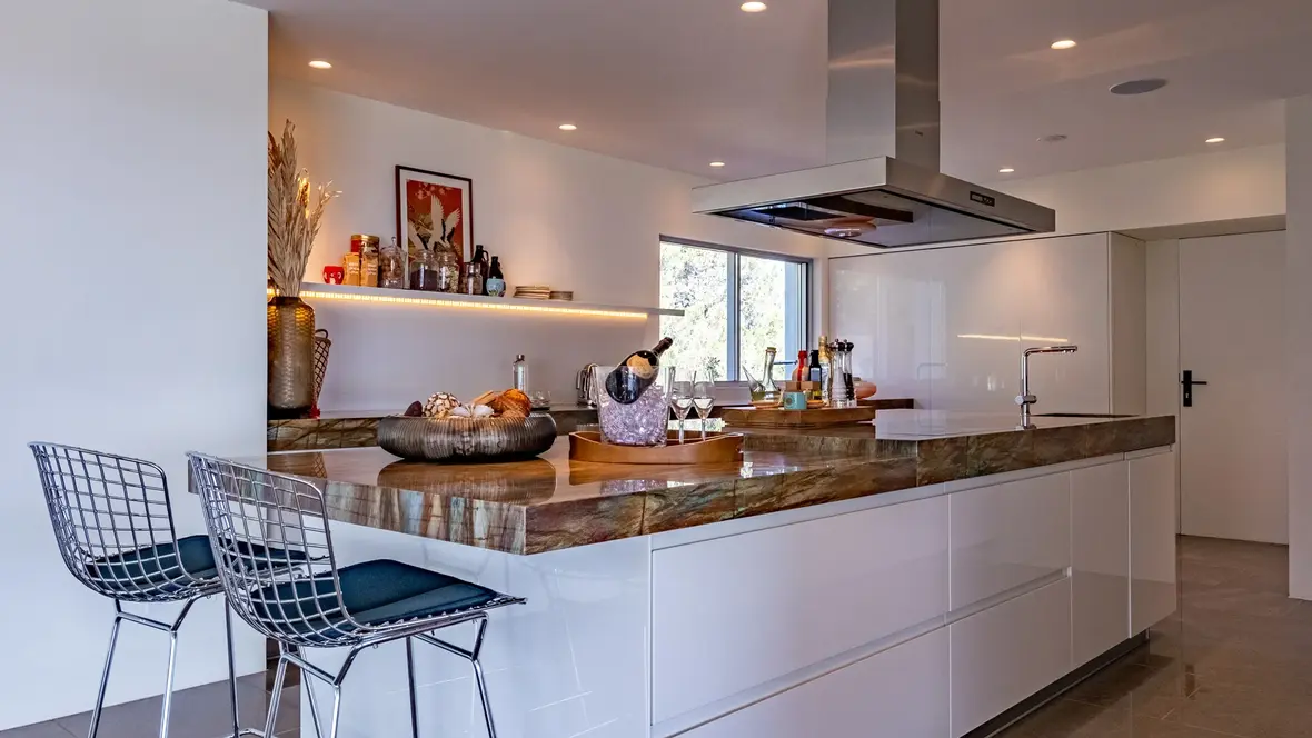 The villa’s five luxurious bedrooms are each equipped with en-suite bathrooms. Three bedrooms are thoughtfully placed on the lower ground level, each with private terrace access, inviting natural beauty and tranquility. Two additional guest suites are located on the main terrace by the swimming pool, each with a private entrance, providing an ideal sanctuary for visitors.