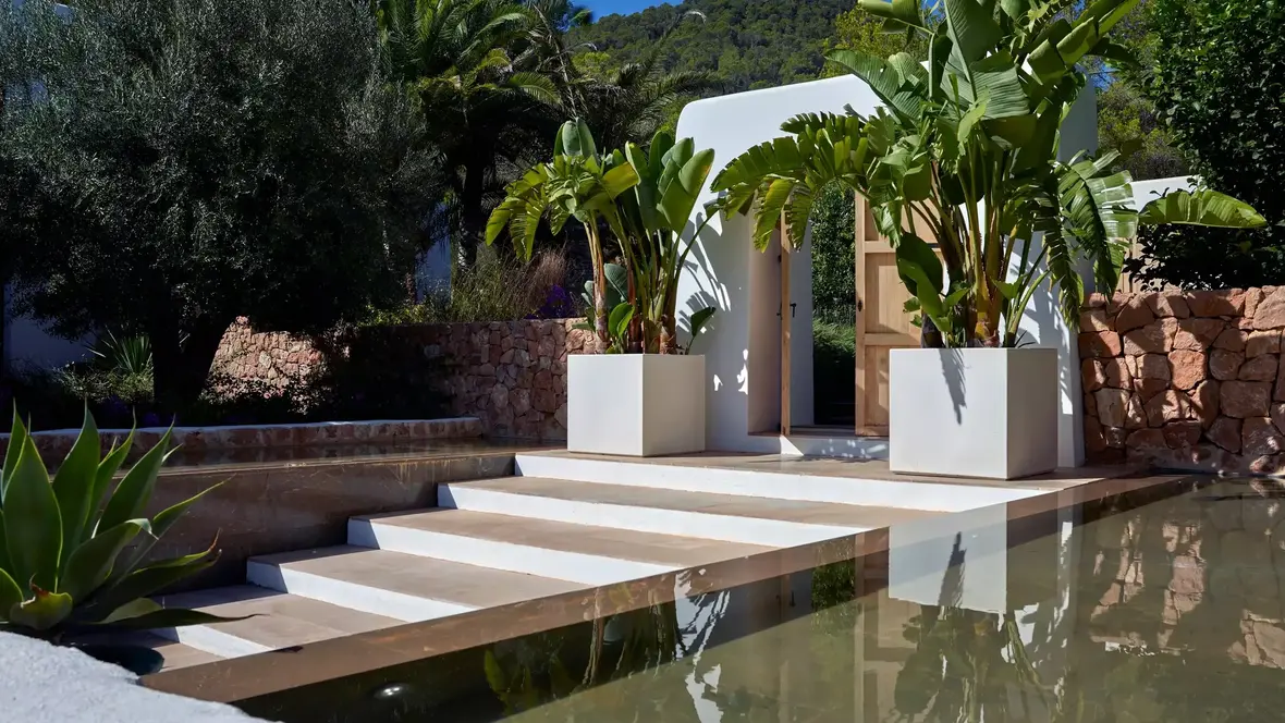 The beautifully landscaped garden is a highlight of the property, offering a peaceful escape with its lush greenery and meticulously maintained lawns. The outdoor spaces are designed to maximize enjoyment of the Ibicencan climate, with ample areas for lounging, dining, and relaxing. The heated pool and surrounding patio area provide a perfect setting for both daytime relaxation and evening gatherings.